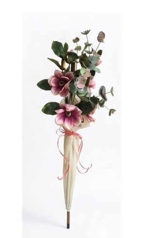 Paraguas decorado con flores artificiales de gran calidad, el paraguas consta de 8 paneles en variada gama de vivos colores. De 105cm de diámetro, con apertura manual y en resistente material poliéster. Con varillas metálicas en color negro, cierre de velcro y suave mango de madera en color natural.